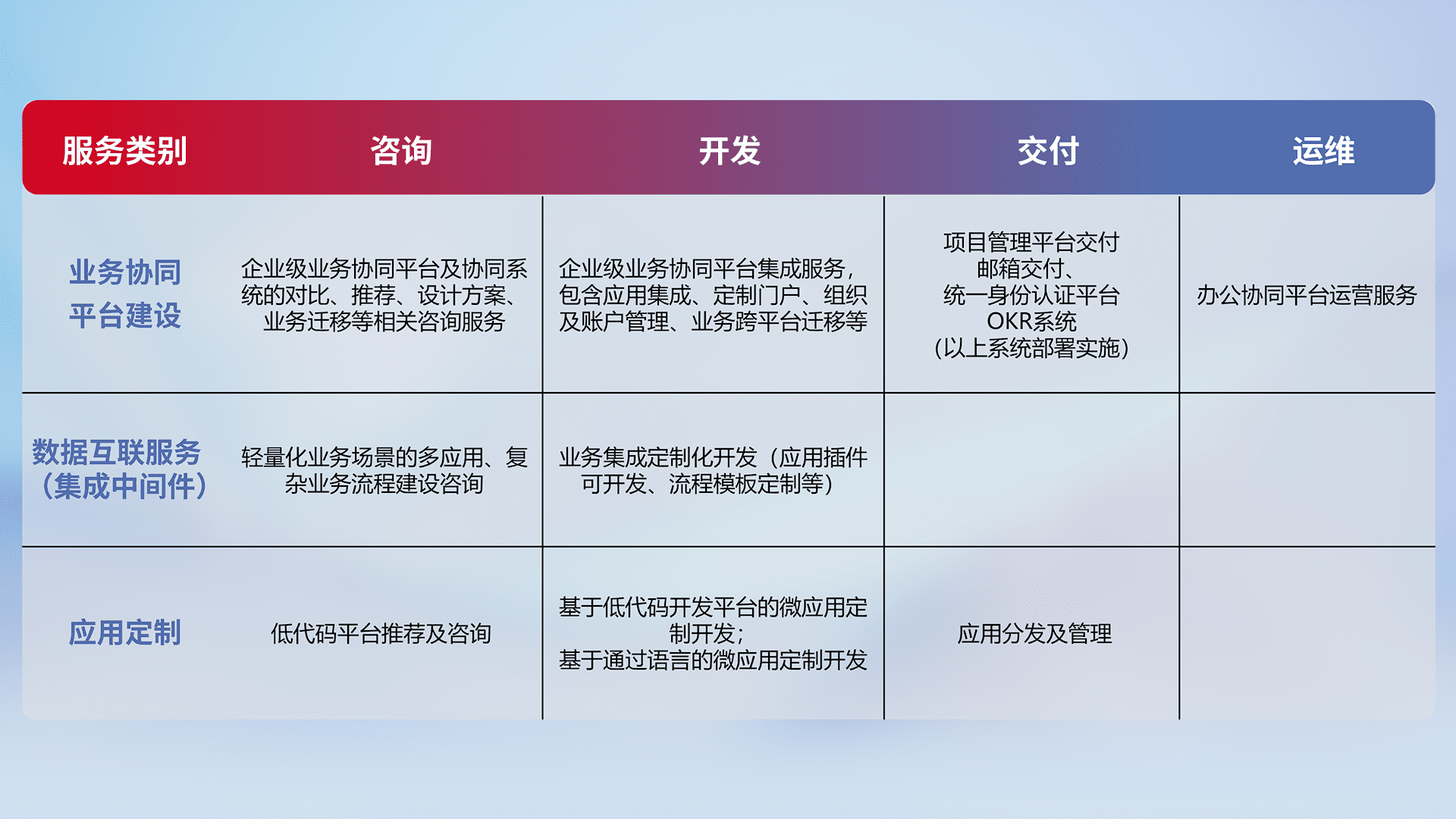 针对钉钉、、、、企微、、、、IDaas等平台级产品提供产品的规划、、、、方案、、、、交付、、定制化开发等服务,,实现如统一协同办公、、、智能客户服务、、混合会议管理、、智能数据查询、、、等业务场景,,,,实现数字化转型。。。。